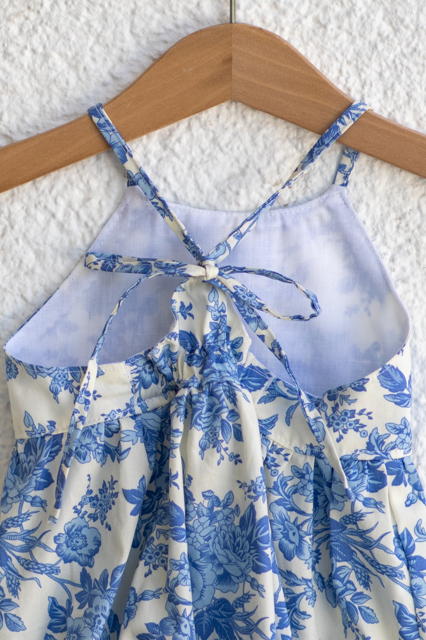 Amsterdam romper features a high neck front bodice, elasticated back and leg openings along with adjustable back ties. complete with snap fasteners for easy nappy changes. In blue vintage floral fabric 100% cotton.